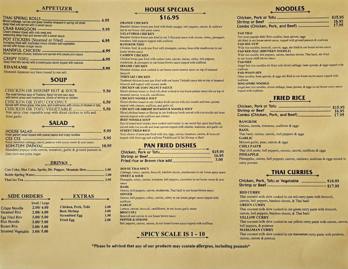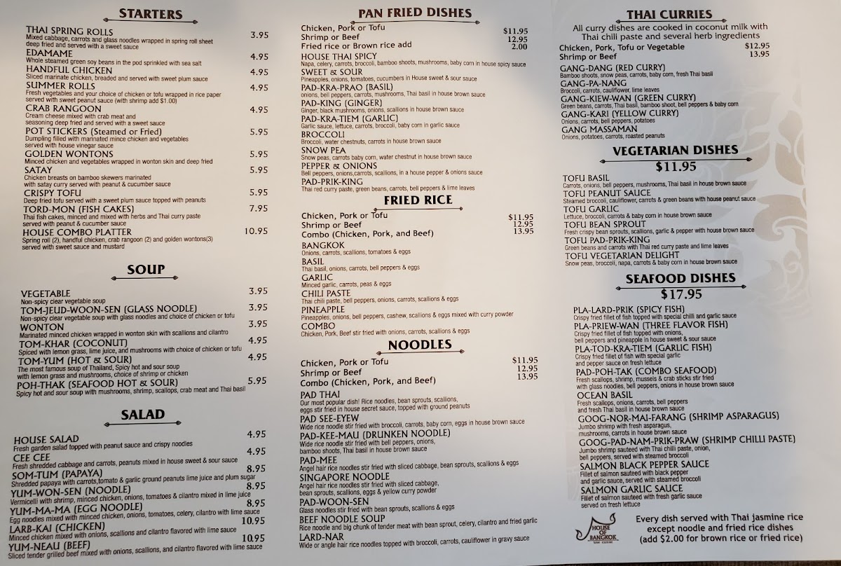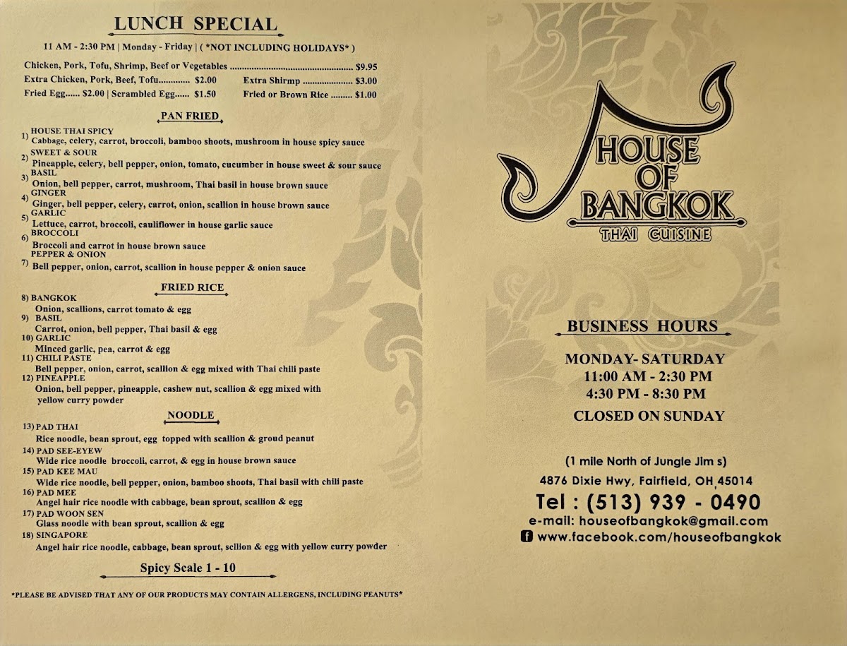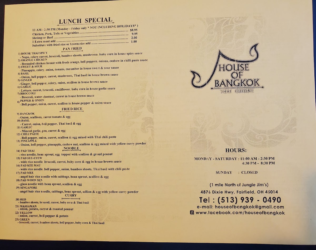 Welcome to House of Bangkok Thai Cuisine, a delightful Thai restaurant nestled at 4876 Dixie Hwy in Fairfield, OH. Known for its authentic flavors and fresh ingredients, this culinary gem is perfect for those seeking a genuine Thai experience. The menu showcases a variety of dishes that highlight the vibrant tastes of Thailand.